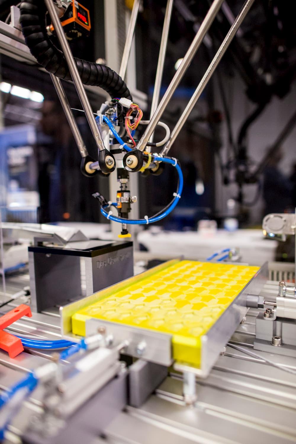 The Delta robot automates the sorting and placement of plastic placeholders into molds, eliminating the need for repetitive manual tasks in the production process.